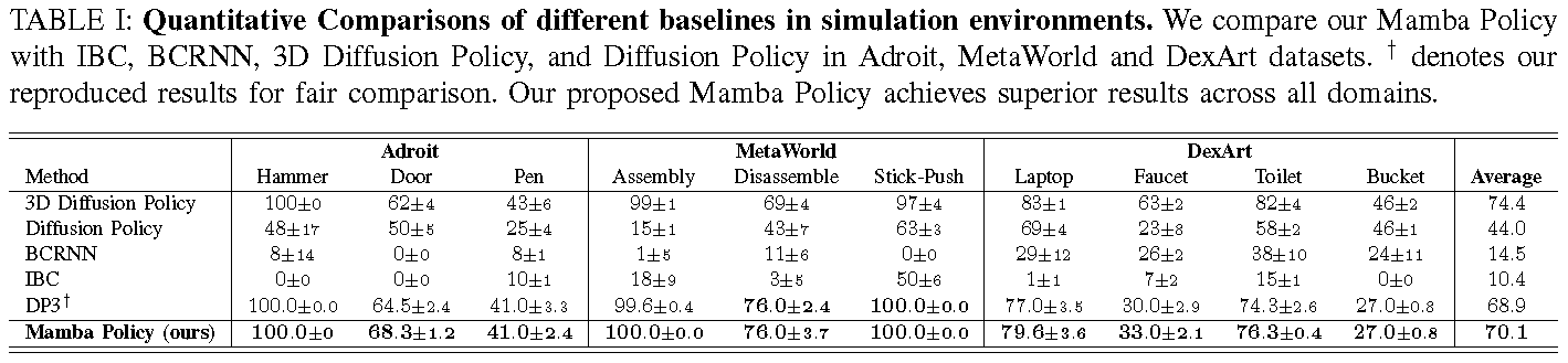 Quantitative Comparisons of different baselines in simulation environments. We compare our Mamba Policy with IBC, BCRNN, 3D Diffusion Policy, and Diffusion Policy in Adroit, MetaWorld and DexArt datasets. † denotes our reproduced results for fair comparison. Our proposed Mamba Policy achieves superior results across all domains.