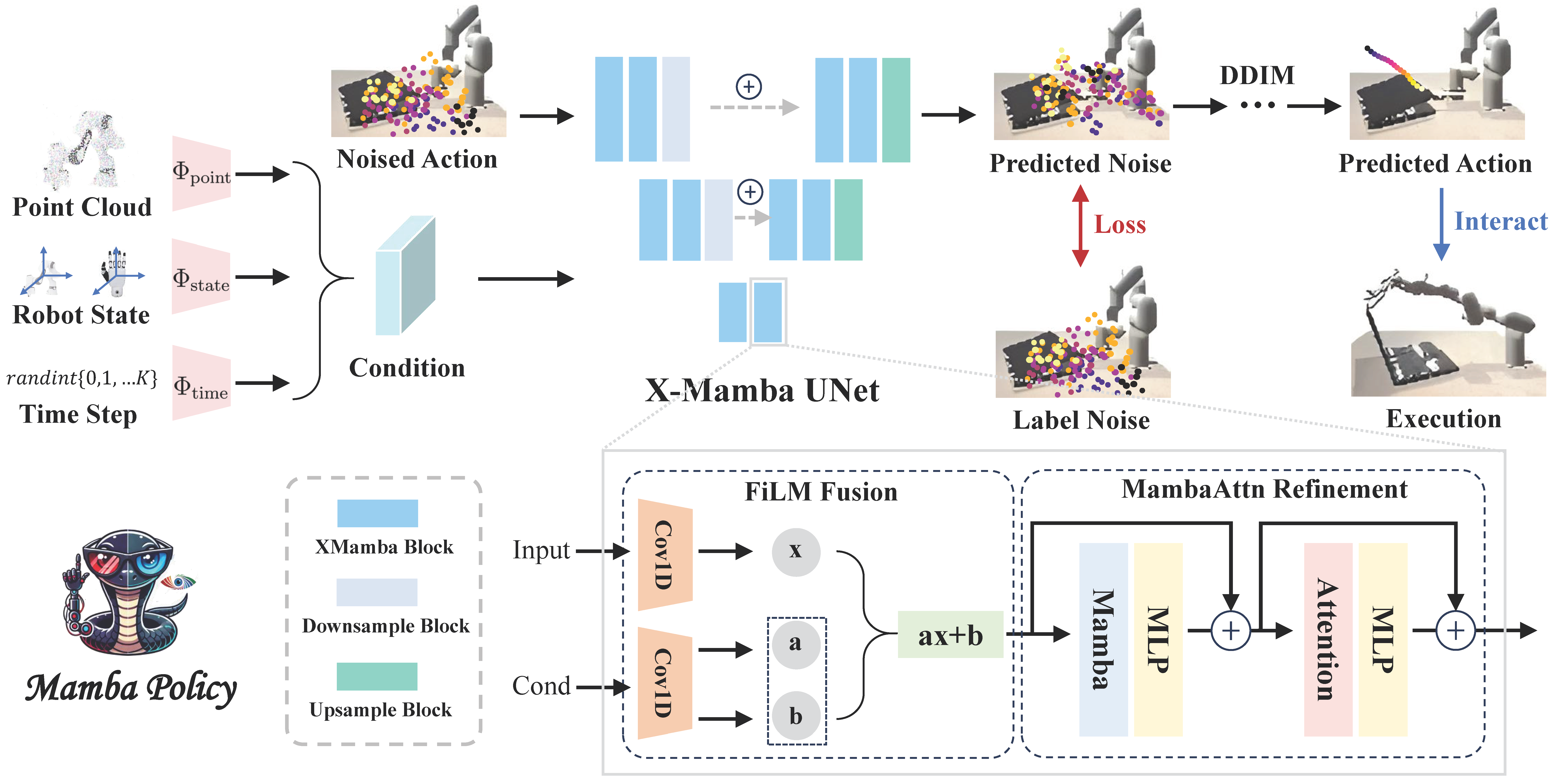 Overview of Mamba Policy. Our proposed model takes the noised action and the condition as inputs, the latter of which is composed of three parts: point cloud perception embedding, robot state embedding, and time embedding. Each of these components is processed through its respective encoder. The X-Mamba UNet is then employed to process these inputs and ultimately return the predicted noise. During training, the model is updated using MSE loss with the label noise. For validation, the model leverages DDIM to reconstruct the original action, which is then used to interact with the environment and execute different tasks.