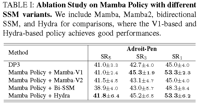 Mamba Policy with different SSM variants. We include Mamba, Mamba2, bidirectional SSM, and Hydra for comparisons, where the V1-based and Hydra-based policy achieves good performances.