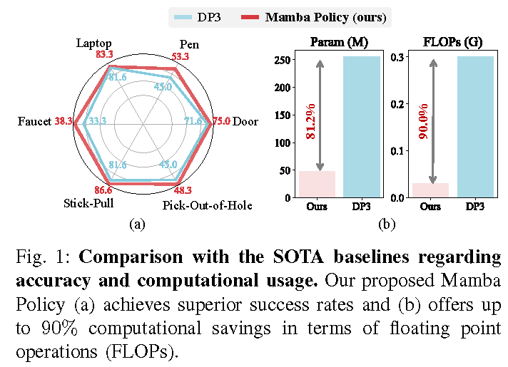 Efficieny Comparisons. Compared with DP3, our proposed Mamba Policy not only achieves superior results but also gains up to 90% and 80% computational savings regarding FLOPs and parameters number .